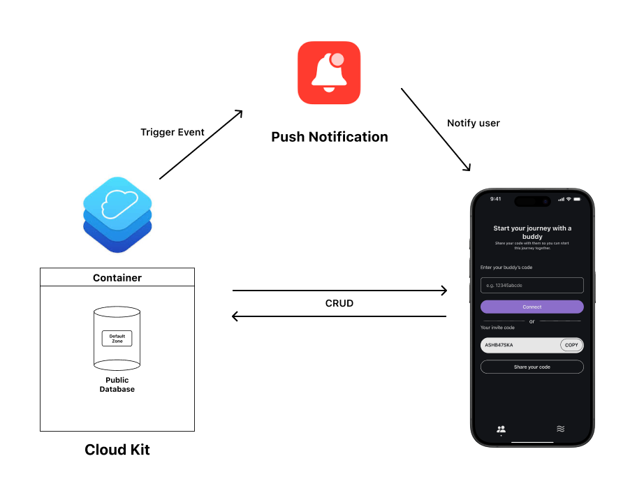 From a technical perspective, the solution is built around real-time synchronization and reliability. CloudKit is used to maintain a shared source of truth for user data, buddy relationships, streaks, and badges, ensuring that both users always see consistent and up-to-date information. Push notifications are integrated to reinforce engagement through reminders, progress updates, and timely encouragement.
