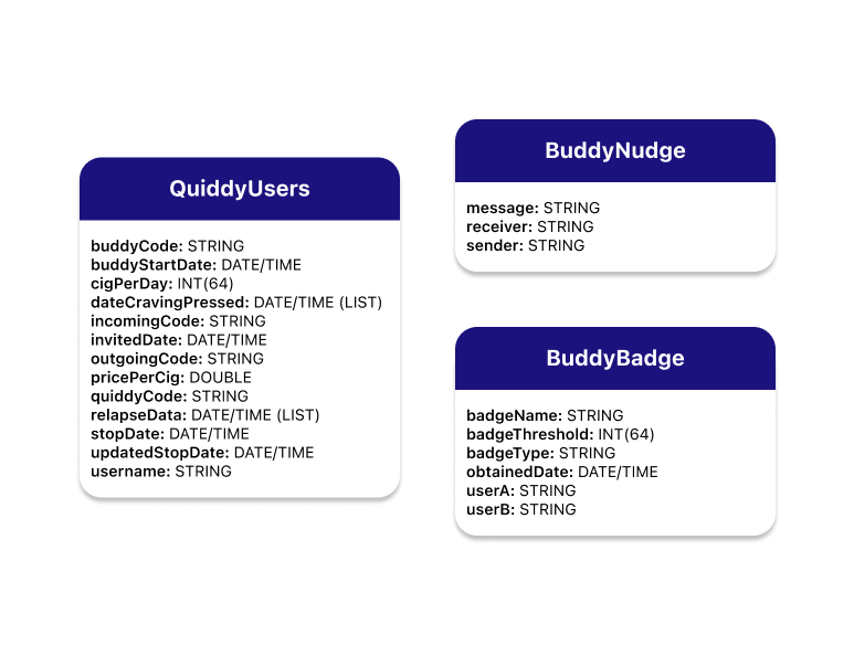 Stores core user data related to smoking behavior, buddy relationships, and progress tracking.